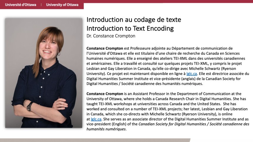 Digital Humanities Summer Institute: Technologies East took place the week of 13-17 May 2019 on the University of Ottawa’s main campus. Workshops offered in 2019 included Introduction to Text Encoding, led by Dr. Constance Crompton, Social Media Analysis led by Prasadith Buddhitha, Introduction to Linked Open Data led by Catie Sahadath, Data Visualisation led by Dr. Jarno van der Kolk, and Digital Composition led by Julian Bertino.