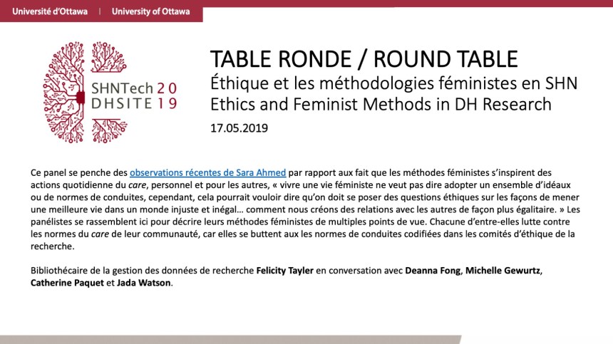 In addition to our keynote presentations, we introduced two roundtables (hosted by University of Ottawa Librarian Felicity Tayler) addressing key issues in DH scholarship, including Research Data Management and Ethics and Feminist Methods in DH Scholarship. We are also collaborated with local and national organisations located in Ottawa throughout the week, including a community research panel featuring curators David Pantalony and Tom Everett from the Canada Science and Technology Museum who presented their collaborative work with professors and students at the University of Ottawa and a presentation by an Ottawa Art Gallery curator who spoke about how feminist methodologies impact her curation practices.