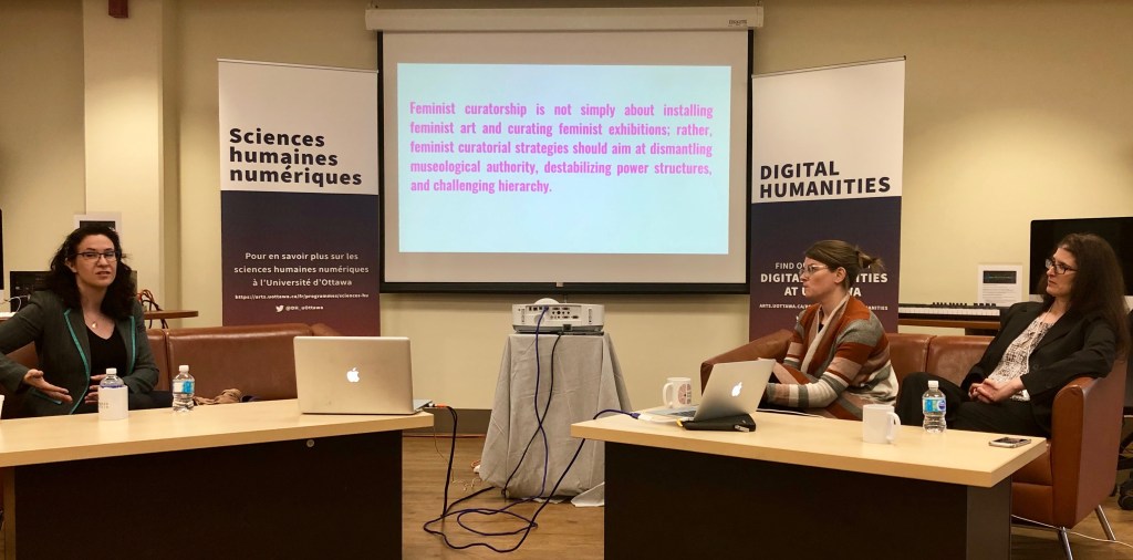 En plus de ces présentations, nous avons introduit deux tables rondes (organisées par la bibliothécaire de l’Université d’Ottawa Felicity Tayler) qui ont abordé les questions clés de la recherche en sciences humaines numériques, notamment la gestion des données de recherche et l’éthique et les méthodes féministes dans. Nous collaborons également avec des organisations locales et nationales situées à Ottawa, notamment un panel de recherche communautaire auquel participent les conservateurs David Pantalony et Tom Everett du Musée des sciences et de la technologie du Canada qui ont présenté leur travail de collaboration avec des professeurs et des étudiants de l’Université d’Ottawa, ainsi qu’une présentation d’un conservateur de la Galerie d’art d’Ottawa qui a parlé de l’impact des méthodes féministes sur ses pratiques de conservation.
